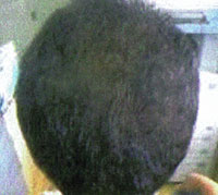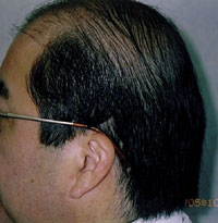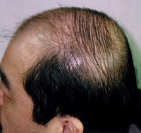 20代の頃より脱毛が激しく、特に左右前頭部から頭頂部半分にかけての禿げ上がりが際だっており、わずかに残っている頭頂部中央も毛も細く弱々しい状態であった。